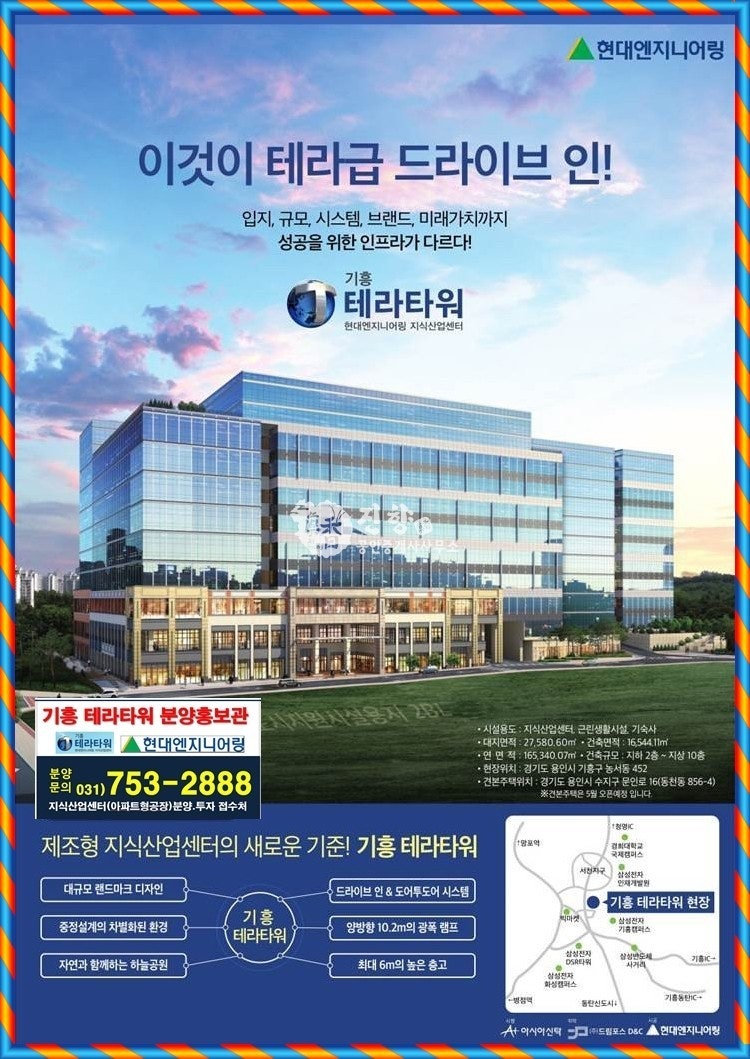 현대 엔지니어링이 드라이브인 시스템에서 시공하고, 삼성 그룹사가 입주하는 반경 250m이내의 삼성 직원만 9만명의 지하철 역이 예정되어 있어 투자 가치 상승이 확실하고 수익률이 상가 3배 이상의 20%대의 수익형 부동산 중 최고이며 정부의 금융 지원과 취득세 등록세 경감 법인세(조건을 충족할 경우 4년간 면제)혜택이 있는 용인 서천 지구 최대 규모로 건물(연건평 63빌딩과 같다)조성되는 기흥 테라 타워를 소개하겠습니다 담당자 연락처:1666-9858수익형 부동산 지식 산업 센터 최적의 입지 조건 기흥 테라 타워는 글로벌 기업 국내 최고의 기업인 삼성 전자 띠 업체가 입주를 기다리는 중 삼성 전자 반도체 기흥 공장 3만명, 삼성 전자 DSR2만명, 삼성 전자 반도체 화성 공장 4만명, 삼성 전자 로지텍,삼성 전자 소재 연구 단지, 삼성 디지털 시티, 삼성 제조 기술 센터 안에 있는 요지에서 유일무이 비즈니스 최적의 입지로 수요는 많은 공급은 절대 부족한 곳이므로 임대 걱정 없이 가격 상승이 보장되었습니다 삼성 전자 협력 업체의 배후 수요 등 수십 만을 넘는 첨단 IT기업의 중심지인 국내 최고의 입지 조건을 갖추고 있어 분양 열기가 뜨거운 특급 투자처를 자랑하고 있습니다 담당자 연락처:1666-9858기흥 테라 타워 부동산 가격 상승이 보장된 서천 역